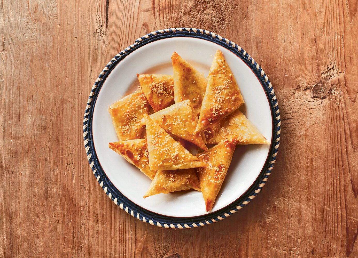 Maryoka艅skie tr贸jk膮ty z chrupi膮cego ciasta filo, wype艂nione kremowo-serow膮 mas膮 z fet膮, mozzarell膮 i 艣wie偶膮 pietruszk膮. Ka偶dy k臋s to kontrast: z艂ocisty, delikatnie posmarowany oliw膮 wierzch i mi臋kka, aromatyczna wk艂adka z wyczuwaln膮 nut膮 czosnkowo-pietruszkow膮. Doskona艂e na ciep艂o, 艣wietnie sprawdzaj膮 si臋 podczas imprez jako przystawka.